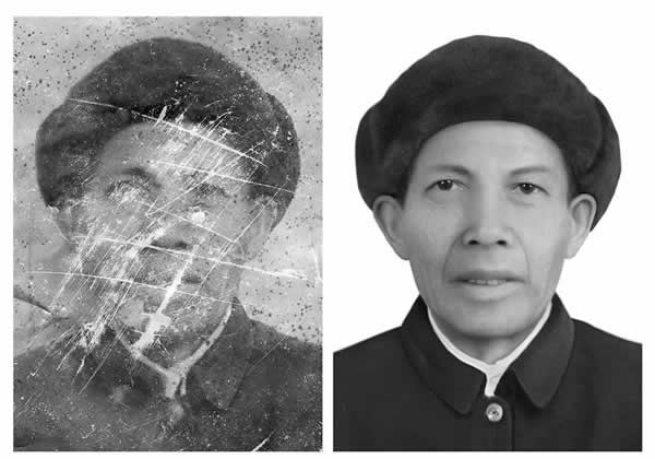 对于特别破损的照片,又是绒面的,带布纹或斑点的。就要用翻新的手段来处理,全面的修整照片。为了尽量避免照片做得平面变形,可以在后期处理上调整。比如添加杂色或移植皮肤层等等,把照片做旧。结合色彩的渲染和背景的处理可以让照片在保持原有相貌不变的情况下焕然一新。当然我们做照片要尽量保持它的历史价值能修复的地方尽量修复,能不改变色彩的尽量不改变。那些不能用简单工具修补的照片尽量不要随便找个人就修,因为处理的过程越复杂 变形的可能就越大,破损程度比较大的照片你要想保持原貌是需要相当专业技术才可以做到的。如果找不到专业的技术人员,那么扫描到电脑保存就可以了。